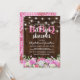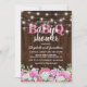 Invitation de baby shower country barbecue avec un fond en bois rustique, des guirlandes de lumières dans le jardin, des fleurs aquarelles élégantes roses et blanches, et un modèle de célébration de baby shower pour couples facile à personnaliser.