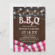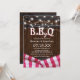 Cartes d'invitation pour baby shower rustique barbecue avec un fond de tonneau en bois de grange, des guirlandes lumineuses, une nappe à carreaux rouges et un modèle de célébration de shower de couple facile à personnaliser.