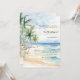 An elegant wedding invitation for a beach wedding, destination wedding. A watercolored sandy beach, ocean waves and palm trees as background.