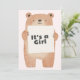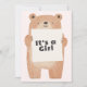 Bienvenue à votre petite fille avec cette adorable invitation baby shower avec une illustration d’ours doux portant une pancarte qui dit "C’est une fille". L'envers comprend des détails d'événement avec un arrière - plan rose doux et une tête ludique sur le thème de l'ours. Parfait pour les baby showers à thème boisé ou animal avec une touche féminine !