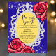 Cette élégante invitation personnalisée présente un thème de conte de Beauté et de Beauté sur un arrière - plan de couleur bleue. La phrase classique de la Beauté et de la Bête de fée, "Be our Guest" est imprimée au-dessus de l'information de l'événement, à l'intérieur d'un miroir de parties scintillant argent avec un arrière - plan jaune. Deux roses rouges en vitraux apparaissent en bas à gauche, avec un seul rose en haut à droite. Les diamants de la parties scintillant mettent l'accent sur les parties supérieure et inférieure.
