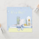 Adorable invitation à la douche pour bébé jaune et bleu avec articles de pépinière emballés à l'arc bleu sucré, blocs de bébé, couches, canard en caoutchouc jaune, biberon et poudre. Cette invitation à baby shower bleu et jaune mignon est facilement customisée pour votre événement en ajoutant simplement les détails de votre événement, le style de police, la taille et la couleur de police et le libellé.