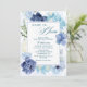 Célébrez l'arrivée prochaine de votre petit avec cette élégante invitation à baby shower floral "Baby in Bloom" à l'aquarelle. Doté d'une douce fleur d'hydrangée blanche et bleue et d'une végétation délicate, ce design dégage un charme botanique et frais, parfait pour un baby shower de printemps, d'été ou d'hiver. Les tons bleus apaisants en font un endroit idéal pour un bébé, tandis que les fleurs d'aquarelle créent une atmosphère intemporelle et classe. Customisez l'invitation avec les détails de votre événement pour le rendre personnel et unique. Idéal pour ceux qui recherchent une invitation baby shower design et nature