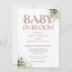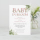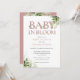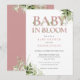 Invitation baby shower bébé en fleurs avec une typographie rose tendre élégante et un joli feuillage de verdure. Conçu par Thisisnotme©