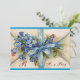 Enveloppe élégante avec ruban bleu et ne m'oubliez pas fleurs, design romantique et classe avec un bébé et cigogne volant parmi le beau rose romantique, roses rouges, fleurs turquoises de printemps bleu. Développement graphique numérique en style vintage par Bulgan Lumini (c). Facile à customiser avec vos initiales et votre propre texte en tant que fête de baby shower / faire-part de naissance / promotion /favors / merci / menu / boîtier / carte de réception pour les fêtes de maman à être / anniversaires / nouveau bébé / enregistrer la date / ou tout événement spécial que vous souhaitez! Tout le texte peut être customisé.