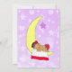 Un petit bébé à la peau foncée et aux cheveux noirs qui pourrait représenter un bébé hispanique ou afro-américain. Le devant représente un bébé dormant sur un nuage avec un fond violet. Le dos représente le bébé dormant sur la lune.