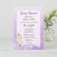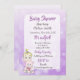 Bébé fille blonde avec invitations de baby shower d'ours en peluche avec des pois et des nœuds violets et blancs.