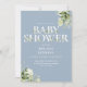 Une invitation de baby shower élégante avec une typographie élégante et un beau feuillage botanique sur un fond bleu poussiéreux et votre code QR au verso. Conçu par Thisisnotme©