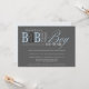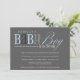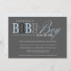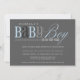 Invitation Baby shower avec les mots "baby boy" en bleu, gris et noir avec les détails de la fête ci-dessous.