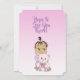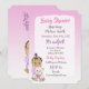 Fille de bébé hispanique ou afro-américaine avec invitations de douche de bébé d'ours en peluche avec fond violet et rose.