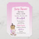 Bébé fille hispanique ou afro-américaine avec un ours en peluche Invitations pour une baby shower avec un fond violet et rose.