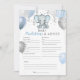 Cette carte de jeu de prédictions bébé avec des bébés éléphant bleu et gris avec des ballons et des confettis. Idéal pour que vos invités s'amusent.