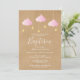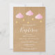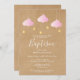 Parfait pour inviter amis et famille à un baptême spécial baptême baptême baptisé baptême. Avec de mignons nuages roses et des étoiles d'or sur des cordes, sur un arrière - plan kraft rustique. Ajoutez les détails de votre célébration en blanc pour créer l'invitation parfaite.