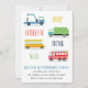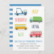 Une invitation pour la fête d'anniversaire d'un enfant avec remorque, camion d'incendie, camion à ordures et un autobus scolaire.