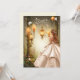 Belle Sweet 16 invitation avec une fille portant une robe magnifique debout près de jolies lampes de jardin dans une forêt. Le texte du sweet sixteen est fait dans un bel argent.