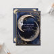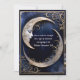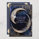 Un beau visage serein dans un croissant de lune, à l'intérieur d'un cadre doré sur un dégradé bleu foncé arrière - plan fait une exquise invitation de fête d'Halloween. L'arrière est une nuance complémentaire de bleu, avec un cadre blanc-or et des lunes de croissant aux coins, avec beaucoup d'espace pour le texte supplémentaire.