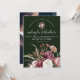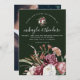 Faire-part de mariage simple et chic présente de belles fleurs de pêche en terre cuite et de prune boho et des feuilles avec une jolie typographie script sur un arrière - plan vert foncé, et la photo du couple sur le dos. Veuillez consulter cette collection mariage moderne pour la coordination des accessoires d'expédition.
