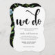 Ce faire-part de mariage chic présente de belles fleurs et de la verdure sur un arrière - plan noir avec une typographie noir fantaisiste.