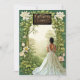 Forêt enchantée, panneau en bois Sweet 16 invitation avec jeune fille aux cheveux foncés portant une magnifique robe verte menthe debout près de l'entrée de sa forêt de jardin enchantée.