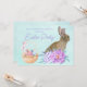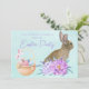 Un beau lapin de Pâques est assis derrière un magnifique bouquet de fleurs violettes et turquoises sur une belle invitation pastel turquoise watercolor party avec élégant script de lavande personnalisée de votre nom de famille sous Happy Pâques. Chic, jolie chasse aux oeufs de Pâques ou invitation de brunch.