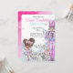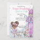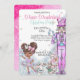 Cette invitation à Noël glamour et festive personnalisée présente un thème de poupée et de casse-noix mignon. Une image d'une jolie poupée princesse de ballet avec des cheveux bruns et un tutu arc-en-ciel est présentée en bas à gauche. Elle a une couronne brillante en diamant et tient un ornement. Le Mouse King et la Reine se tiennent sur le côté de la poupée de ballerine. Une grande image du Casse-Noisette se trouve à droite, devant un sapin de Noël rose étincelant. Des arrosages de fausse parties scintillant ajoutent du glam aux illustrations. Le titre "Winter Wonderland" est imprimé en haut dans une police élégante de caractères rose. "Christmas Party" est imprimé ci-dessous dans une belle couleur turquoise.