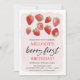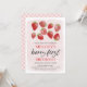 Cette douce invitation pour le 1er anniversaire de fraise présente des fraises originales peintes à la main à l'aquarelle sur un fond rose clair.