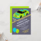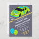 Célébrez son quatrième anniversaire avec style. Ces invitations personnalisés présentent une illustration d'une voiture de course de style stock en vert citron et bleu vif. Cette voiture numéro 4 a le slogan NEED 4 SPEED sur le capot, ce qui la rend parfaite pour les fêtes de 4ème anniversaire pour les garçons. Le graphique de la voiture est placé contre un arrière - plan de course gris et accompagné d'illustrations d'un drapeau à damiers et d'un ballon du parti de coordination. Cette invitation est prête à être customisée avec tous les détails de votre fête.