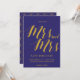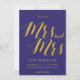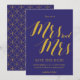 Un "Save the Date" rustique chic, présente les "Mrs et Mrs" avec des lettres calligraphiées de couleur or sur fond bleu cobalt.