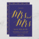 Un "Save the Date" rustique chic, présente les "Mrs et Mrs" avec des lettres calligraphiées de couleur or sur fond bleu cobalt.
