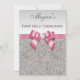 Les premières invitations de sainte communion de rose fait sur commande élégant pour des filles avec de beaux bijoux scintillants de paillettes d'une image imprimée d'argent, motif de gemmes, rose brillant mignon et sophistiqué ont imprimé des arcs et des images de rubans et de jolis diamants d'image numérique bling les bijoux et le texte de gris argenté sur un arrière - plan argenté de gradient. Notez svp : Tous les invitations sur Zazzle ont des images imprimées d'appartement. Ces ęrs invitations chics, de fantaisie, fascinants, girly de communion sont décorés les deux côtés. Invitations belles, élégantes, chics, à la mode, modernes, de tape-à-l'oeil et de charme. Le texte, la police et la couleur de la police peuvent tout être customisés. Si vous avez besoin d'aide customisant votre produit svp contactez-moi par mon magasin. Je serai heureux d'aider.