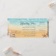Invitation de billet de mariage de destination tropicale avec un fond ombré rustique jaune à bleu aquarelle, étoile de mer, coquillages, guirlande lumineuse, deux cœurs dans le sable avec vos initiales, et une section de réponse. Veuillez noter : vos invités devront couper la partie réponse de l'invitation et vous la renvoyer dans une enveloppe séparée (non fournie). La section de réponse mesure environ 3x4 pouces.