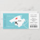 Une faire-part de mariage amusante mais élégante dans un style carte d'embarquement/billet pour les couples se mariant à l'étranger dans l'ISland espagnol de Majorque qui est montré dans une silhouette carte blanche sur le bleu turquoise avec coeur d'amour rouge sucré, silhouette d'avion et perles blanches tourbillonnant en forme de coeur. L'inverse est facile à customiser avec vos détails personnels et une photo du couple heureux
