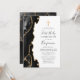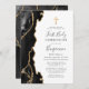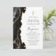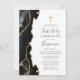 Le bord gauche de cette élégante invitation à la première communion moderne comporte une bordure d'aquarelle noire ornée d'une parties scintillant en faux or. Une fausse croix de feuille d'or apparaît au-dessus du texte personnalisable, qui combine l'écriture manuscrite, les polices cuivre et italique en gris fusain sur un arrière - plan blanc. L'envers est assorti d'un design d'agate noir et or.