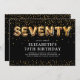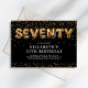 Invitation moderne de 70ème anniversaire avec un arrière - plan noir élégant, une diffusion de confettis de parties scintillant or, ballons d'hélium or qui épellent "soixante-dix", et un élégant modèle de texte de fête qui est facile à personnaliser.