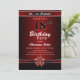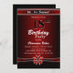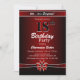 Une invitation à la fête de 18e anniversaire rouge et noir avec un texte blanc et un ruban rouge et blanc et un arc. Remplacez les détails de cette invitation par les vôtres pour créer l'invitation de fête d'anniversaire parfaite pour votre événement.