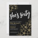 Chic Sixty Black Gold 60th Birthday Party Invitation. Une invitation amusante mais élégante à la fête du 60e anniversaire avec de l'or girly, des fleurs noires et blanches pour les jeunes de coeur. Veuillez noter qu'il n'y a pas de brillant ou de feuille d'or, il s'agit simplement d'une couleur. Un motif de fleurs ludique encadre une typographie de script "she's soixante" mélangée avec une police serif plus classique. Célébrez soixante ans de vie avec ce magnifique design botanique. La partie amusante est que vous pouvez changer TOUTES les couleurs! ! Vous pouvez non seulement modifier les couleurs et la police arrière - plans, mais vous pouvez également modifier les lignes des fleurs. Disponible sous forme d'invitation imprimée ou d'invitation numérique téléchargeable que vous pouvez envoyer par e-mail ou avoir imprimé localement !