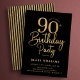 Black gold 90th birthday party invitation. Trendy modern design, perfect for a stylish men's or women's bday celebration. Features script font and stripes on the back. Customize with your own details. Printed Zazzle invitations or instant download digital printable template.