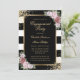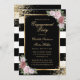 Élégante invitation de fiançailles rayées en noir et blanc avec des fleurs roses rousses encadrant les détails de l'événement dans un cadre doré orné de confettis dorés. Éléments correspondants disponibles. Invitation florale florale floue. Invitation de la partie fiançale noire et or.