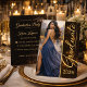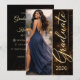 Conception de graduation noir et or avec un fond de poussière lumineuse, un affichage de nom en écriture fluide et une mise en page raffinée. Associée à une photo pleine face avant et des détails d'événement clairs au dos. Idéal pour organiser une soirée de remise de diplômes élégante avec dîner, boissons et danse.
