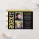 Annoncez votre diplômé de lycée en style avec ce faire-part de graduation multi-photo et l'invitation de la fête. La carte bidirectionnelle "Now and then" présente deux photos de la grade (une photo actuelle et plus ancienne de leur premier jour d'école) avec un design simple et masculin avec des lettres d'inspiration jersey de sport. Les couleurs noir, or et blanc peuvent être customisées pour correspondre aux couleurs de l'école. Un motif à rayures blanches habille le dos de la carte. *Conseil photo : recadrez vos photos en forme de carré avant de les télécharger.