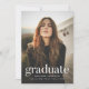 Simple graduation invitation featuring the graduate's vertical vertical "graduate" displayed in white modern lettering. Personalize the photo graduation party invite by adding the graduate's name, school name, and graduation year. The invite reverses to display your graduation party details with a black background.
