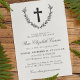 Elégante invitation funéraire blanche avec une croix à l'intérieur d'une couronne de laurier et votre formulation d'invitation dans des polices élégantes. Invitation funéraire chrétienne en noir et blanc avec une croix. Invitation de service commémoratif personnalisée avec le nom de votre être aimé dans un magnifique script sous une croix à l'intérieur d'une couronne de laurier.