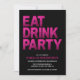 Célébrez en style avec cette audacieuse invitation de fête d'anniversaire "Eat Drink Party"! Avec une grande typographie à effet parties scintillant rose contre un arrière - plan noir solide, cette invitation est parfaite pour un 50ème anniversaire, ou n'importe quel âge vraiment ! Le modèle personnalisable vous permet d'ajouter facilement votre nom, votre âge et les détails de la fête dans la typographie moderne blanche et rose, le dos de l'invitation a un arrière - plan noir simple.