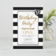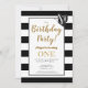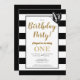 Une invitation moderne en noir et blanc 1er anniversaire avec du texte noir et or et un ornement papillon noir.