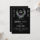 Arrière - plan noir. Une couronne fleurie faite de fleurs de lavande et de verdure d'eucalyptus aquarellée. Personnalisez et ajoutez un nom et des détails. Texte blanc.