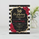 Elégante invitation à 50e anniversaire fleurie avec votre photo au verso de la carte. Noir noir blanc rouge design avec faux or parties scintillant. Caractéristiques noir et blanc rayures, roses rouges, police de script et confetti. Parfait pour une fête anniversaire adulte élégante. Personnalisez avec vos propres détails. Peut être customisé pour n'importe quel âge ! Invitations Zazzle imprimées ou téléchargement instantané modèle imprimable numérique.