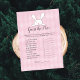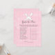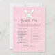 Un lapin lapin blanc au-dessus du titre de jeu avec bébé fille rose, diamant Jacquard arrière - plan. Modèles créés pour vous. C'est un Devinez le jeu de baby shower des prix.
