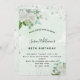 Une invitation moderne, élégante et glamour pour une fête d'anniversaire de 40ème femme (ou tout âge). Un arrière - plan vert aquarellé avec de la poussière de parties scintillant en faux argent, des fleurs blanches et de la verdure. Le nom est écrit avec un script de style moderne en lettres de main noire. Personnalisez et ajoutez le nom, l'âge et les détails de votre fête