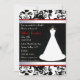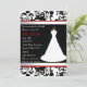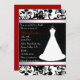 Invitation nuptiale formelle de douche faite dans un motif de noir et blanc de damassé, sur le dessus et le bas. Une belle robe de mariage sur un support décoratif décore le côté droit de l'invitation, et la frontière rouge affile un satin blanc regardant le ruban, de chaque côté du secteur noir des textes. Customisez le texte pour adapter à vos besoins de partie.