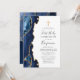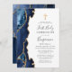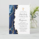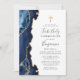 Le bord gauche de cette élégante invitation à la première communion moderne comporte une bordure en aquarelle bleu marine ornée d'une parties scintillant en faux or. Une fausse croix de feuille d'or apparaît au-dessus du texte personnalisable, qui combine l'écriture manuscrite, les polices cuivre et italique en gris fusain sur un arrière - plan blanc. L'envers est assorti d'un design d'agate bleu marine et or.